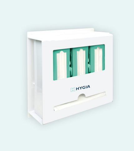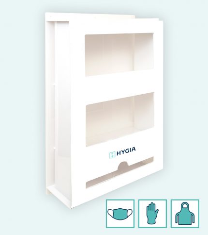 Practical and hygienic the Hygia medi centre dispenser allows work surfaces to be kept clear and uncluttered. Easy to load and easy to dispense the medi centre gives good visibility to the products and can hold multiple boxes at the same time so it requires less refilling. The top chamber can be used for gloves and / or masks. Consumables can be restocked/filled from either side of the dispenser, simply slide up the chamber and restock.